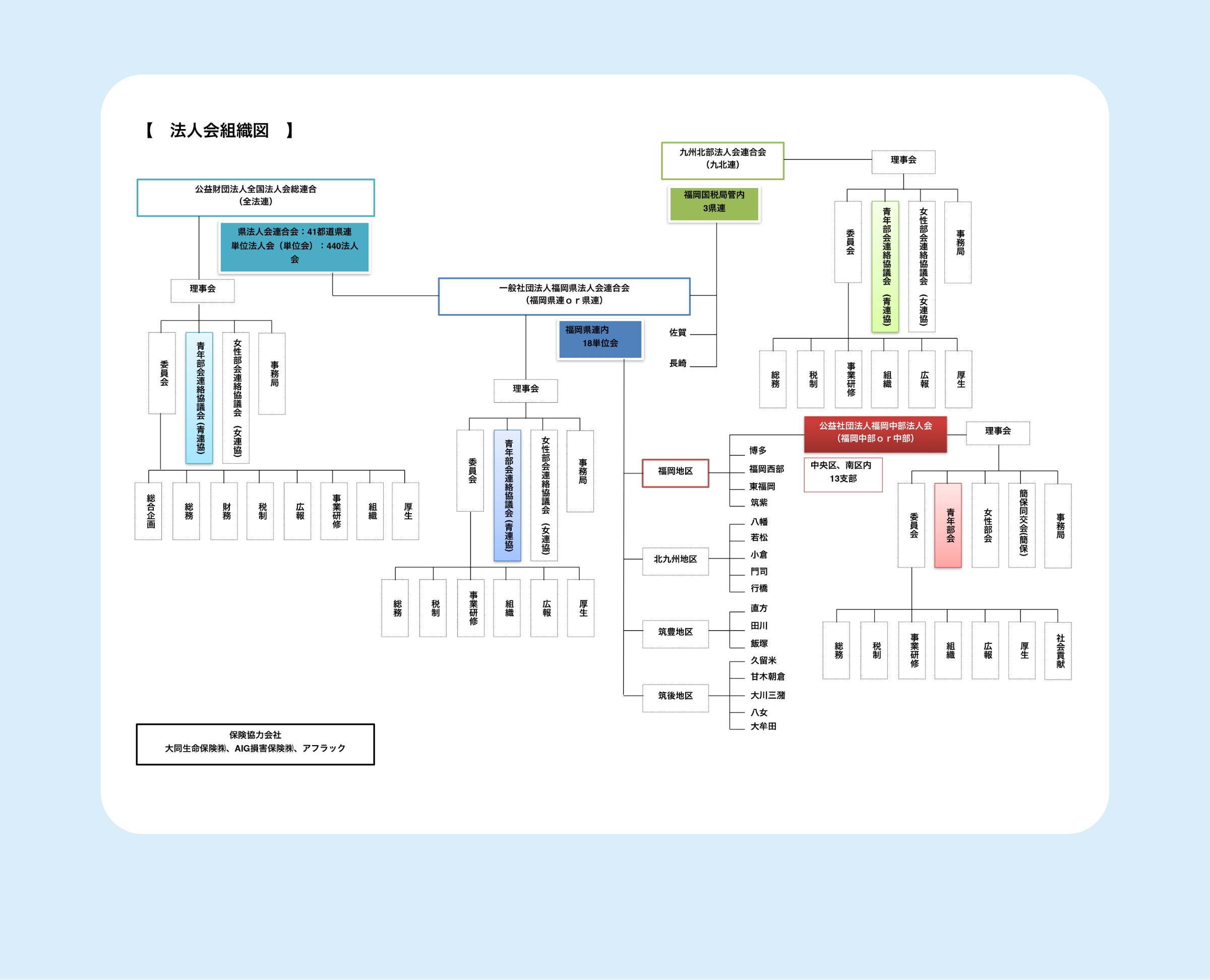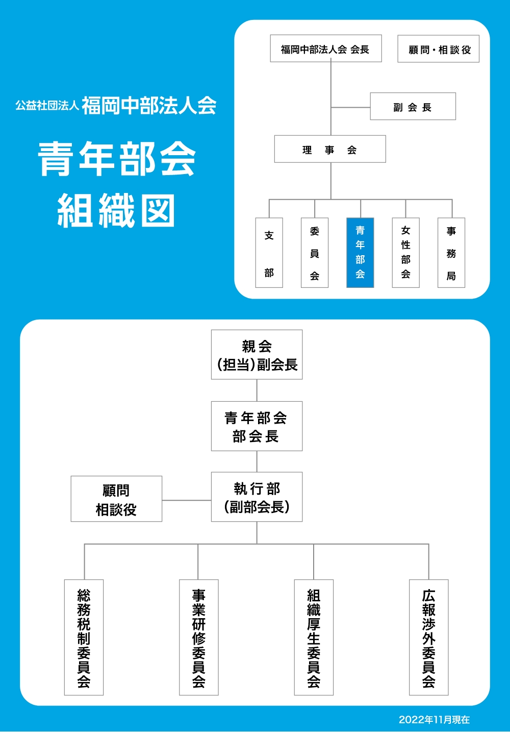 福岡中部法人会 会員の中でも若手経営者は、法人会の活性化と充実に寄与する重要な存在であり、法人会の次世代の担い手として大きな役割を有していることもあるため、50歳未満の若手経営者を対象とした「青年部会」を設けました。