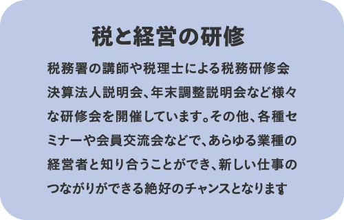 | 事業研修 | 各種研修会(税務研修会・経営セミナー)に関する企画、実施 | 2月 |