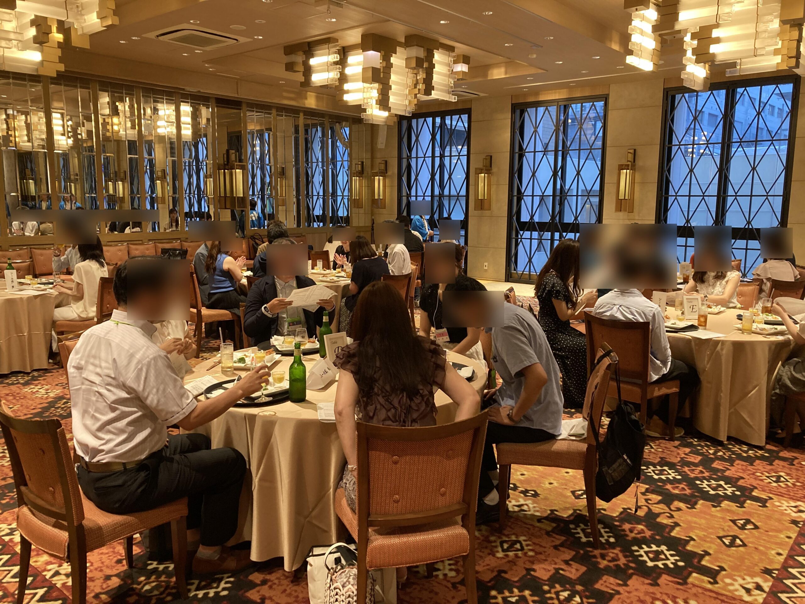 写真にあるとおり、まずはテーブルに座って食事をしながら ❝自己紹介❞をしていただきます。その後、約10分ごとに男性参加者には別のテーブルに移動していただき、女性参加者全員に自己紹介をしていただきました。