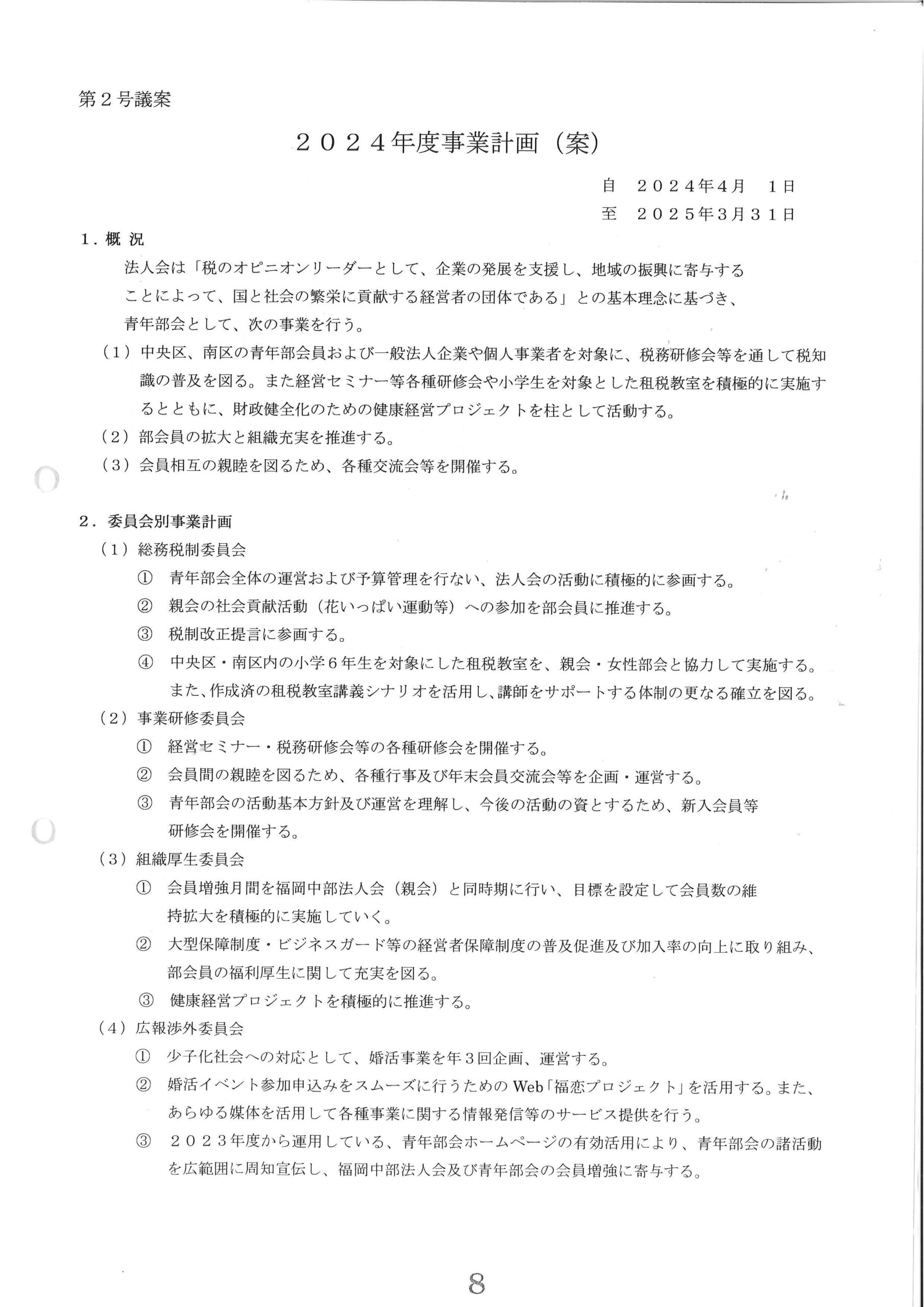 令和6年6月13日(木)福新楼で第13回定時総会を開催した。 竹井総務税制副委員長司会のもと、第1号議案、第2号議案を粛々と審議し、異議質問なく、了解された。