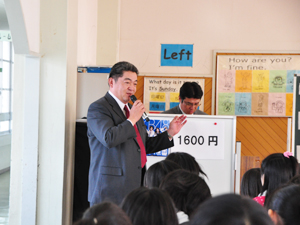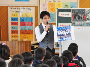 ▲初の2時限授業を担当する芦塚講師と竹井講師が、子供たちの前で自己紹介