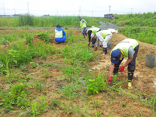 今回の作業内容は畑の石ころ除去や草取りなど、一見地味な作業には見えますが、小雨の降り続く中、中腰姿勢でなかなか体力を使う作業でした。