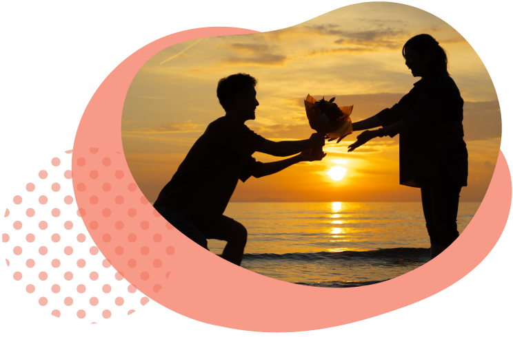 当ページのモチーフは、運命の出逢いを繋ぐ「赤い糸」と、ひもを引いて結ぶことから人と人を結びつけるという意味をもつ「水引」。この水引の結び方は「あわじ結び」といって、いったん結ぶと解くことが難しく、また両端を引っ張るとさらに強く結ばれることから「末永くお付き合いを」という意味が込められおり縁結びにぴったりといえます。