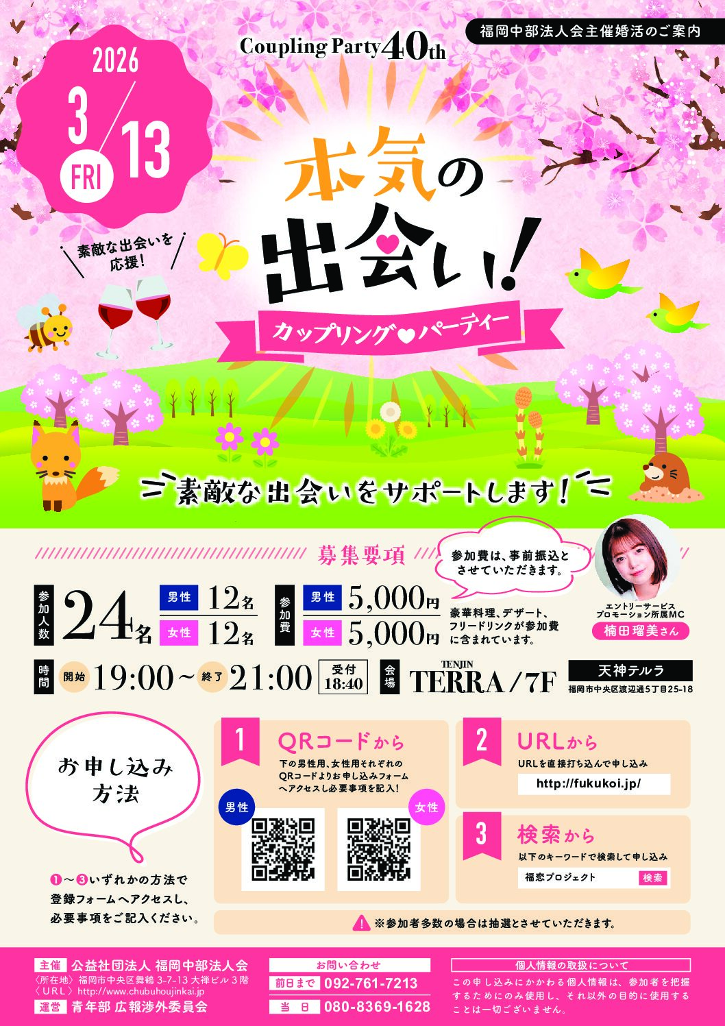 福岡中部法人会 青年部会 公益事業委員会が運営する、ボランティアベースの婚活支援事業です。法人会会員企業に勤務する方などに出逢いの場の提供を行うことで地域社会に貢献することを目的としており、現在は年に3〜4回、カップリングパーティを開催しています。