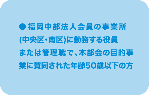 - 福岡中部法人会員の事業所(中央区・南区)に勤務する役員または管理職で、本部会の目的事業に賛同された年齢50歳以下の方